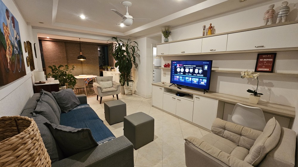 Sala, 2 quartos, cozinha, 2 banheiros e varanda. Acomoda até 6 pessoas.